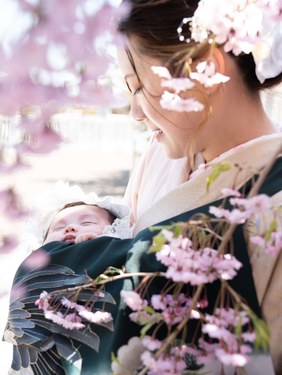 桜の花に包まれて、ママの腕の中ですやすや眠る姿。